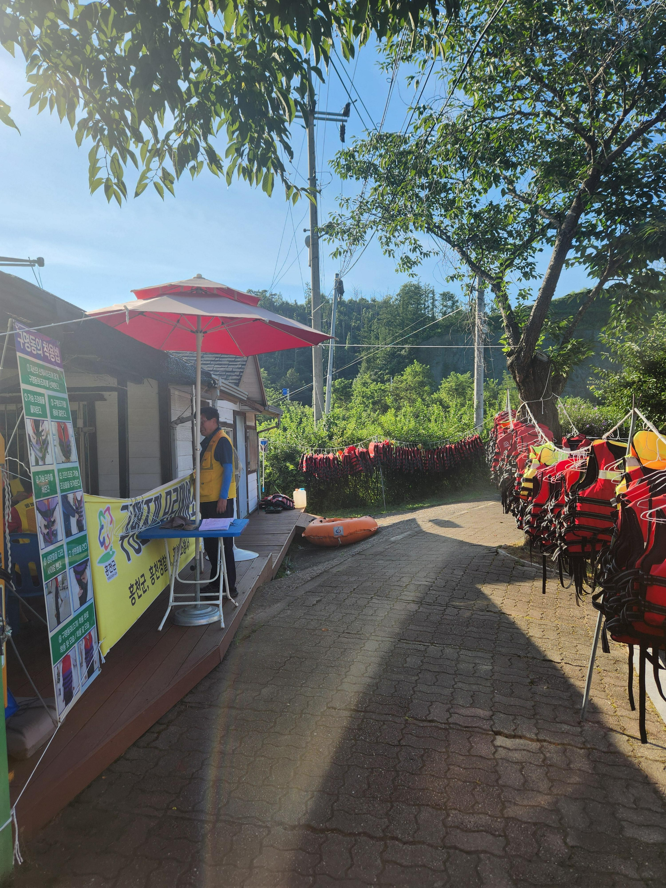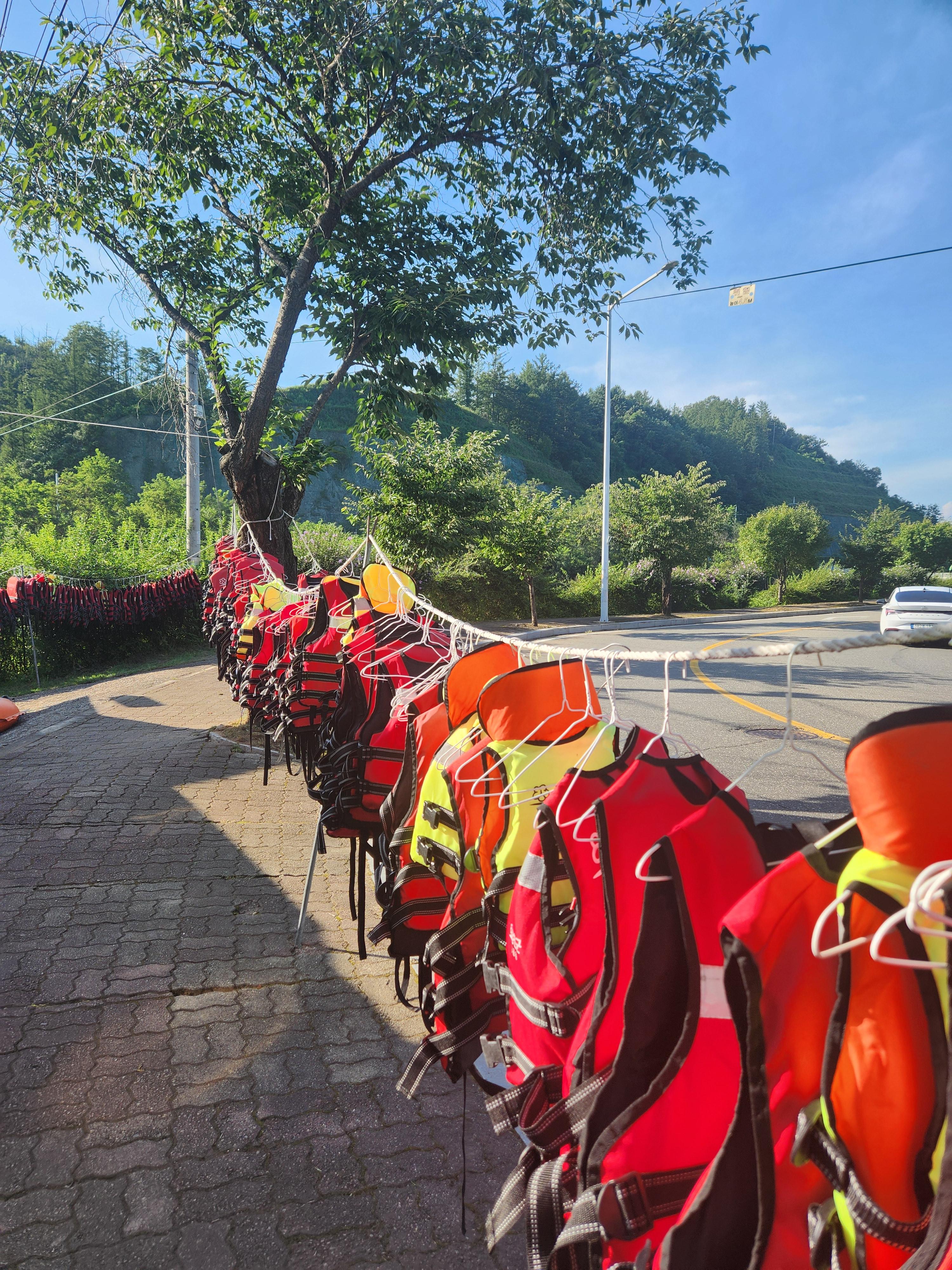 계곡에 가까이 가보니 멀리서 보던 것과는 달리 물의 유속이 빨랐는데 안전한 물놀이를 위해 홍천군에서 제공하는 구명조끼 무료대여 서비스 덕분에 너무 즐거운 시간을 보낼 수 있었다