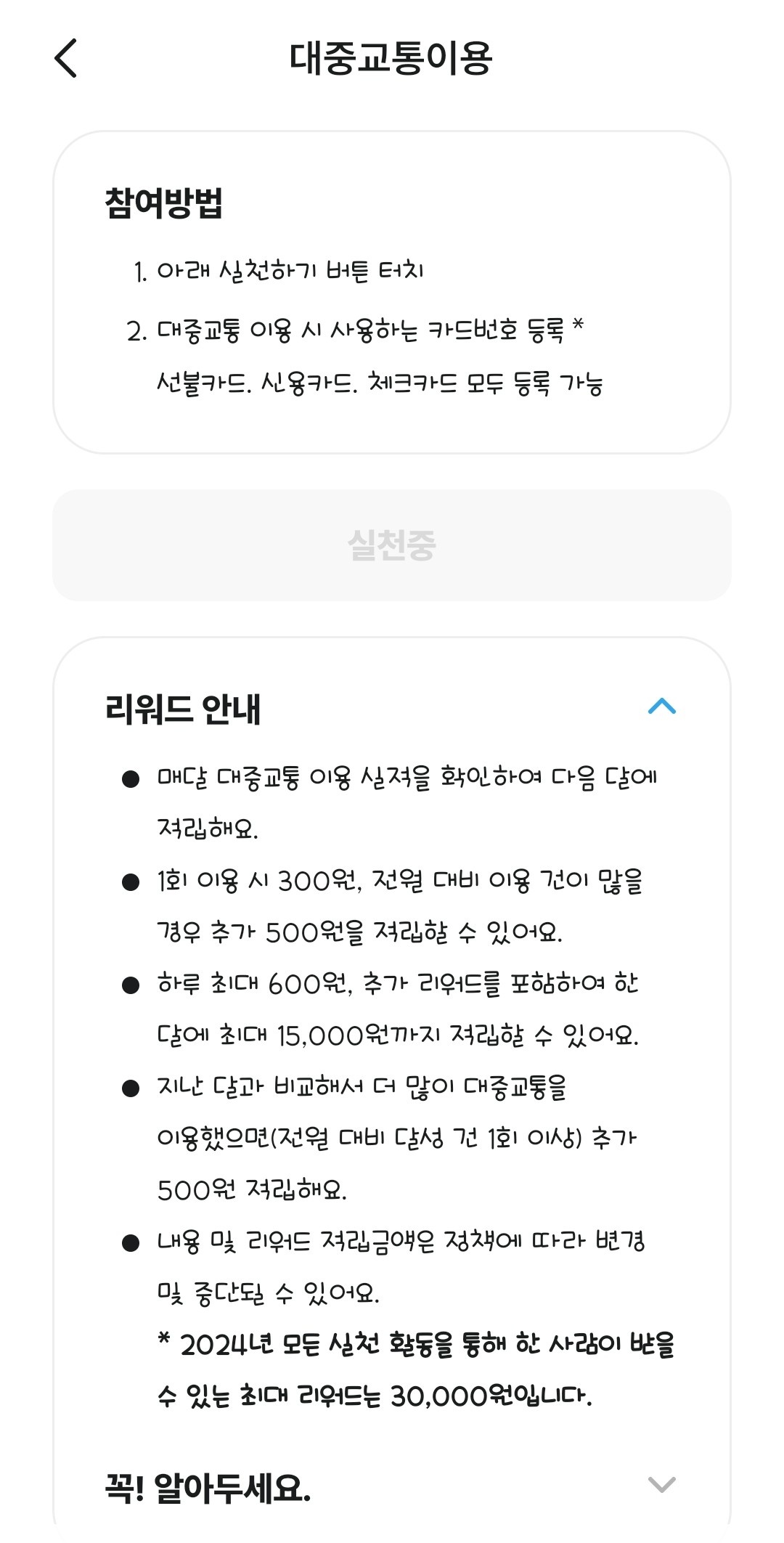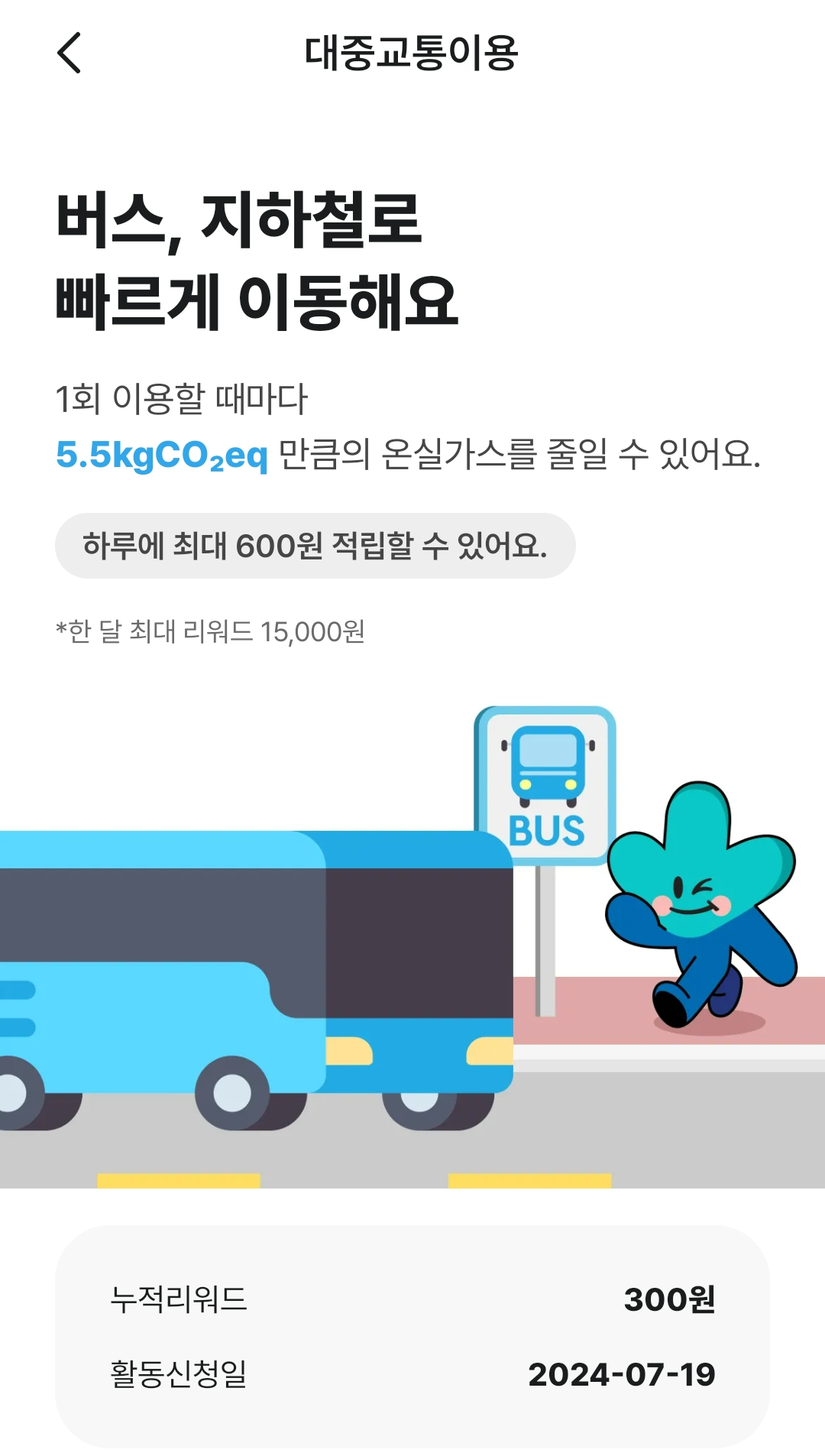 대중교통은 1회 이용 시 300원, 하루 최대 600원이 적립되었는데 실제 해보니 등록해 둔 교통카드로 대중교통을 이용하기만 하면