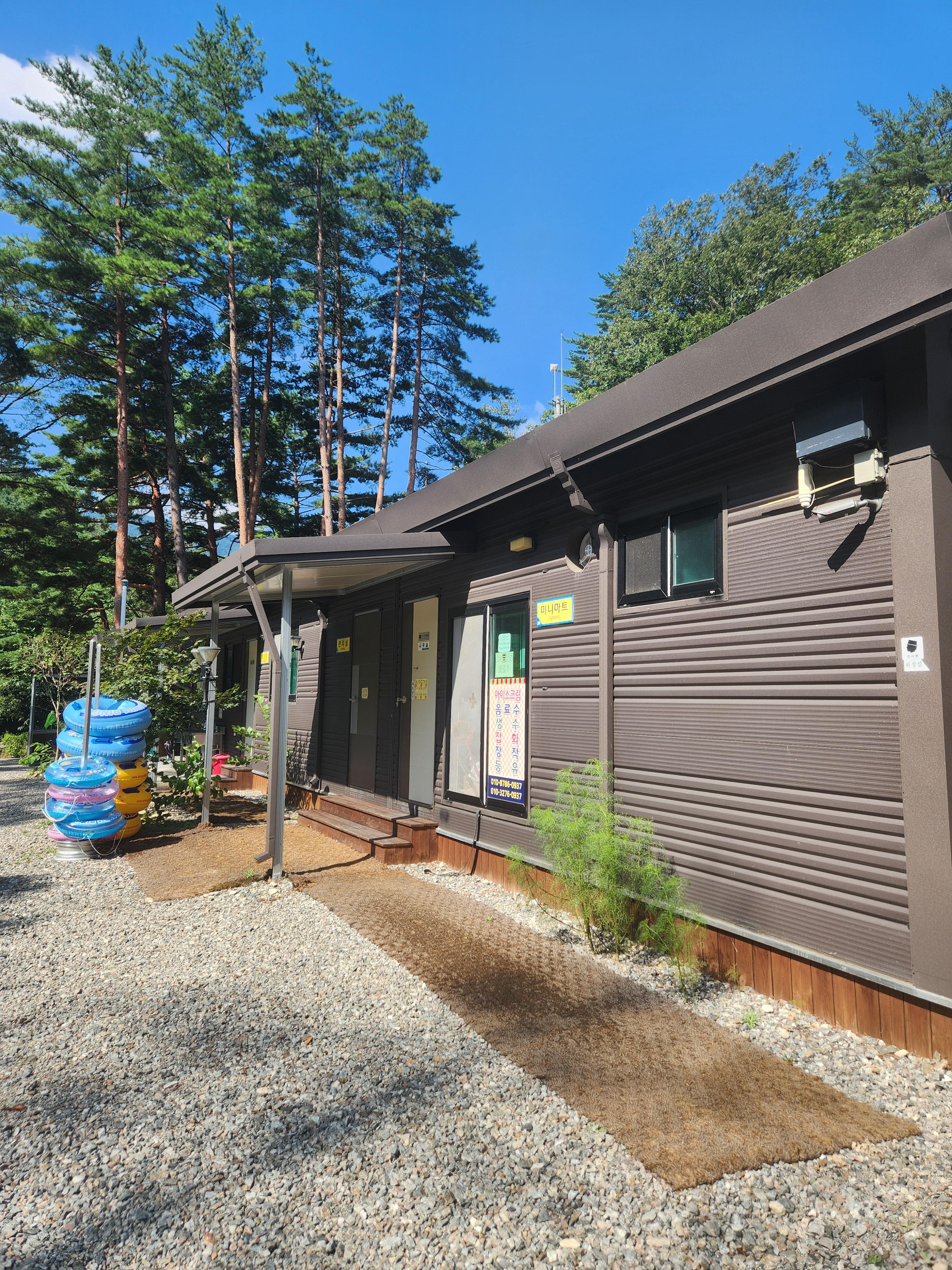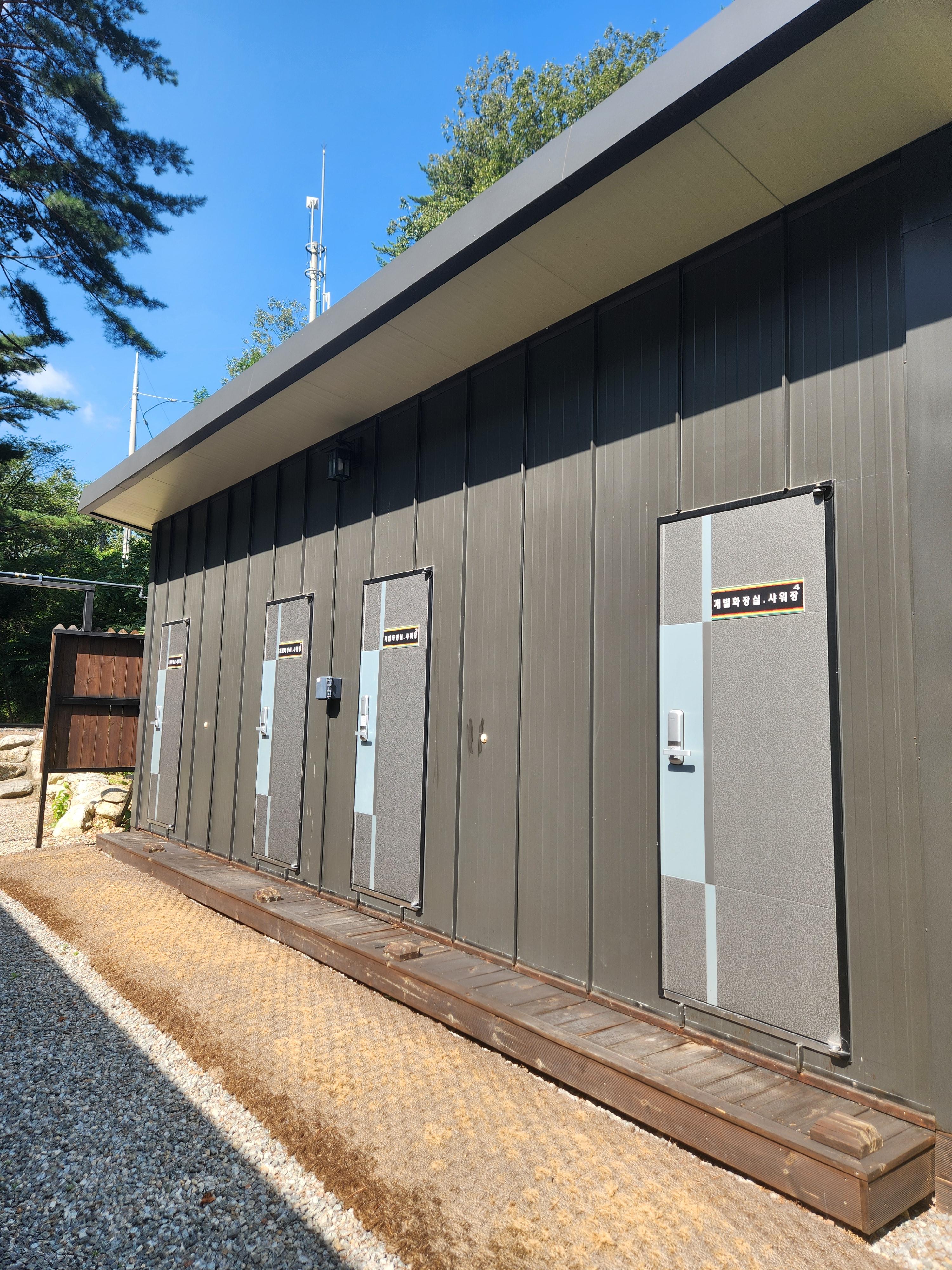 제일 왼쪽은 매점과 개수대가 있는 건물, 뒤쪽으로 개별 화장실(선착순, 비용 별도)이 있는 건물과 화장실 내부