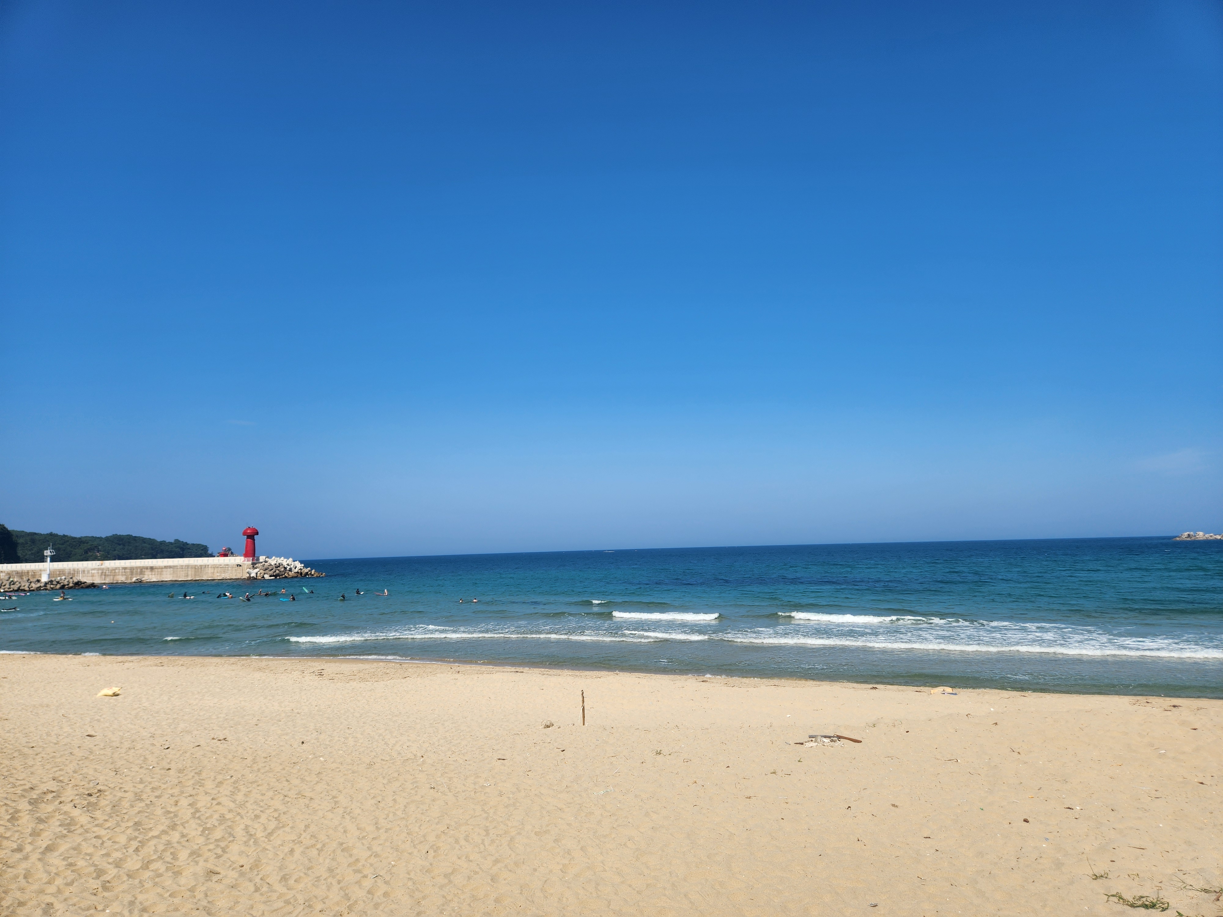 캠핑장으로 가는 길에 있는 38선 휴게소에 들러 커피를 산 뒤 바로 연결되어 있는 해변으로 내려가서 바닷가 산책을 했다