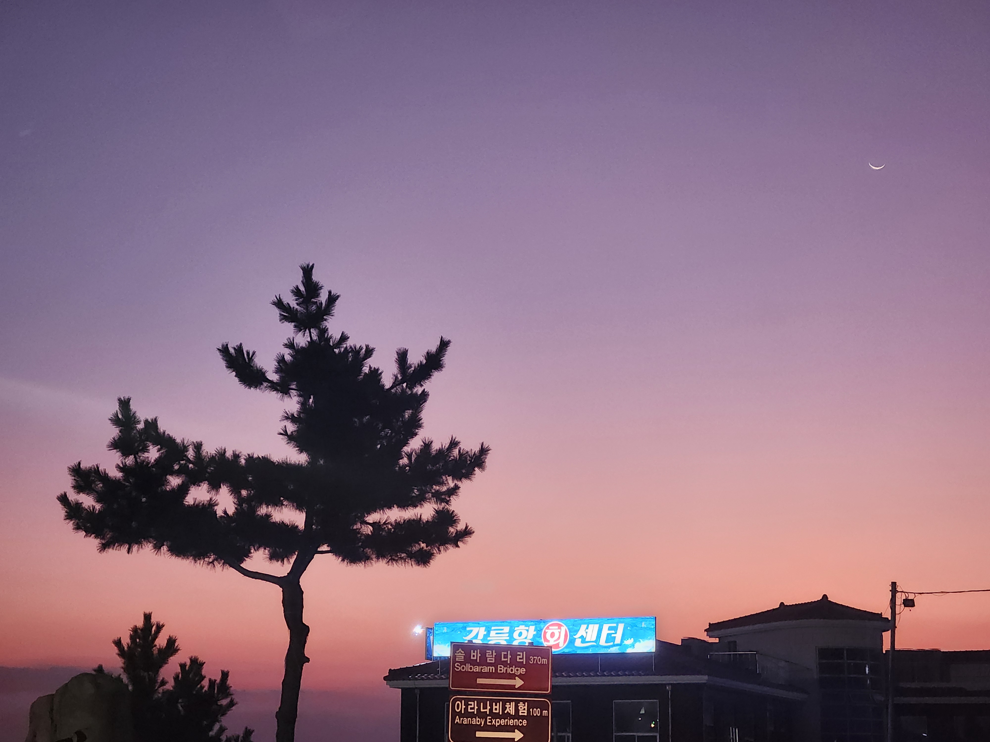 새벽 항구에서 바라본 하늘-살짝 보이는 달과 보라색 그라데이션 하늘-소나무 한그루