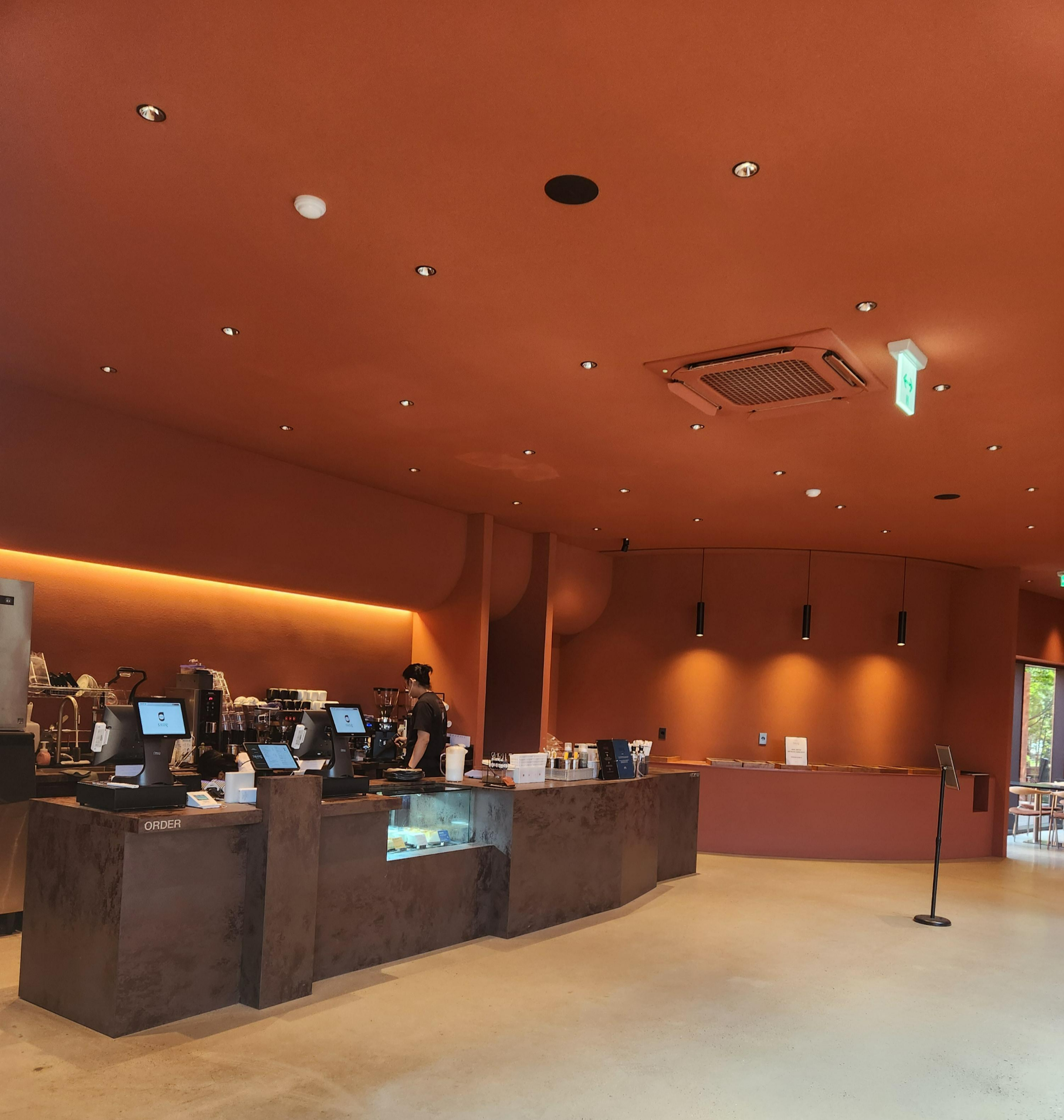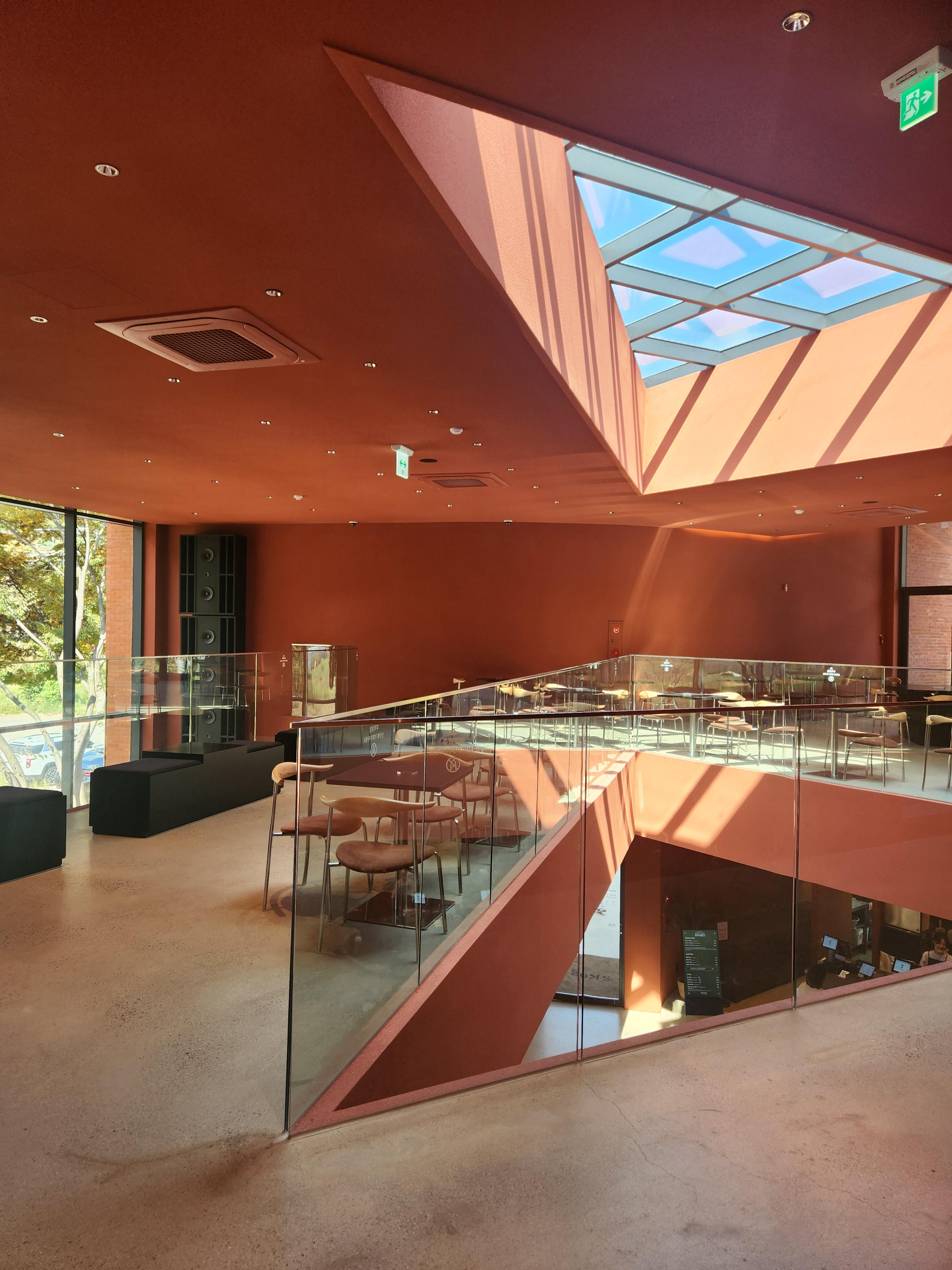 까페 내부 역시 전체적으로 붉은 톤으로 인테리어가 되어 있었는데 중앙이 뻥 뚫려 있는 데다가 빛이 잘 들어와서 어두운 느낌은 들지 않았다